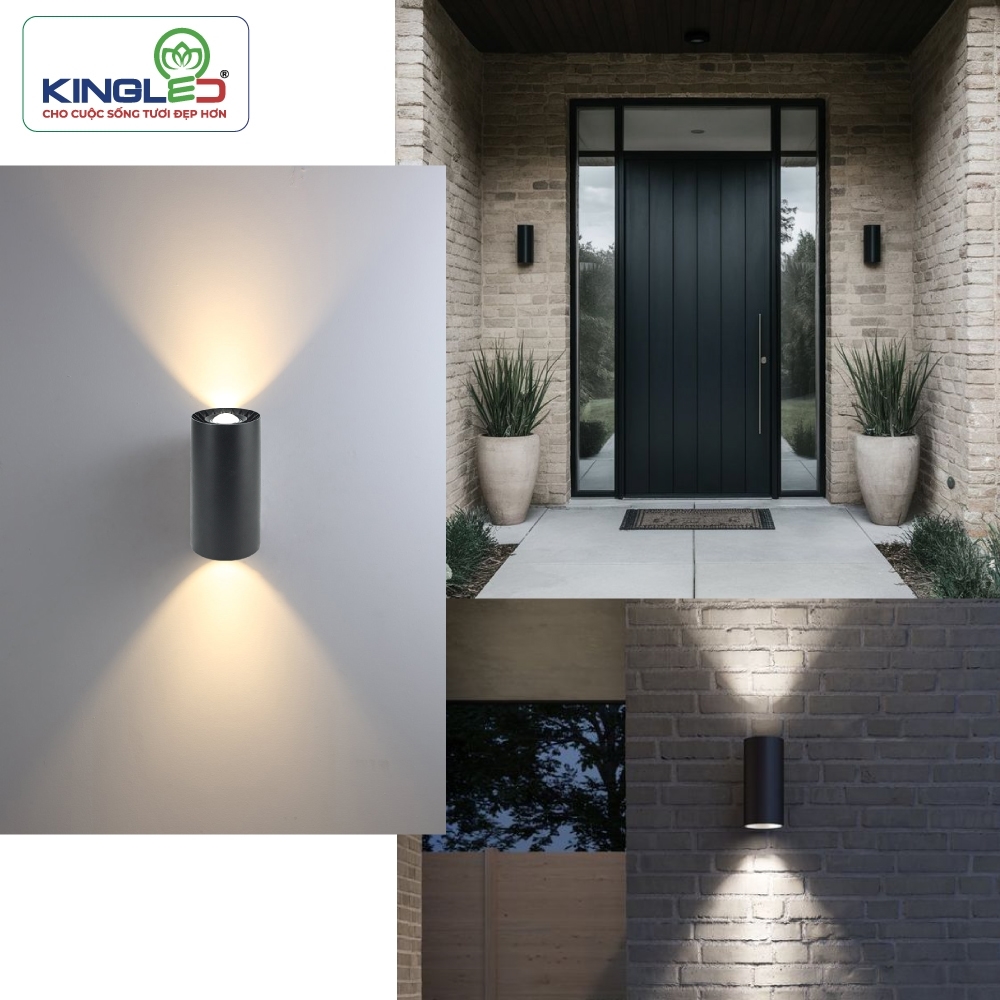 Đèn được trang bị ánh sáng chiếu lên – chiếu xuống, tạo ra những vệt sáng rõ nét trên bề mặt tường. Hiệu ứng đối xứng này giúp làm nổi bật kiến trúc công trình, đồng thời tạo nên điểm nhấn thị giác ấn tượng vào ban đêm.
