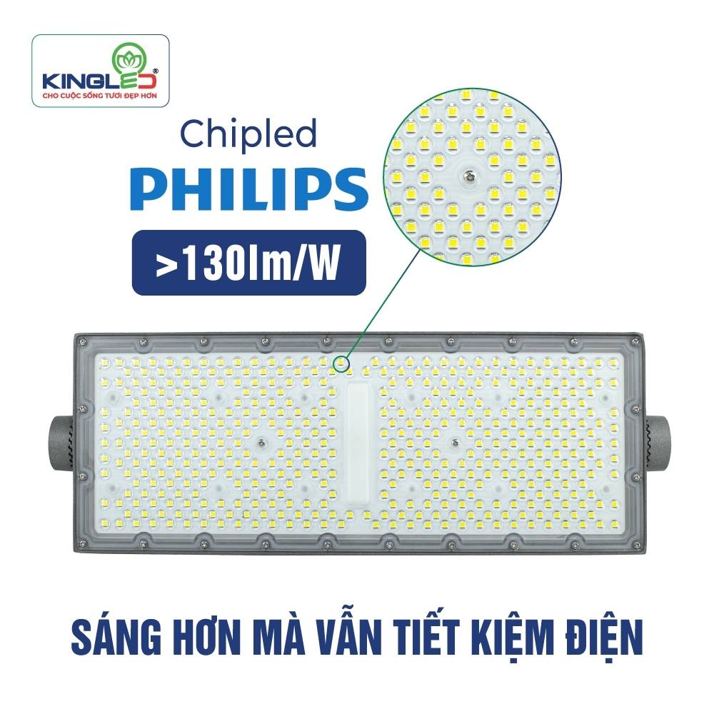 PLMD sử dụng chip LED Philips hiệu suất cao, hiệu quả quang >130 lm/W. Điều này có nghĩa là cùng một lượng điện, bạn có được nhiều ánh sáng hơn, giúp giảm chi phí vận hành theo tháng nhưng vẫn đảm bảo yêu cầu kỹ thuật cho sân và kho bãi.