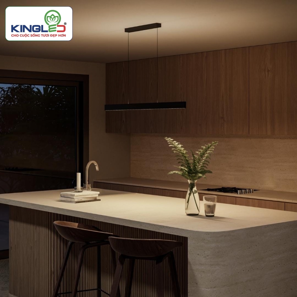Lắp DTP trên bàn ăn hoặc góc sinh hoạt chung giúp ánh sáng trải đều, không gắt, mang lại cảm giác ấm cúng cho cả gia đình khi quây quần.