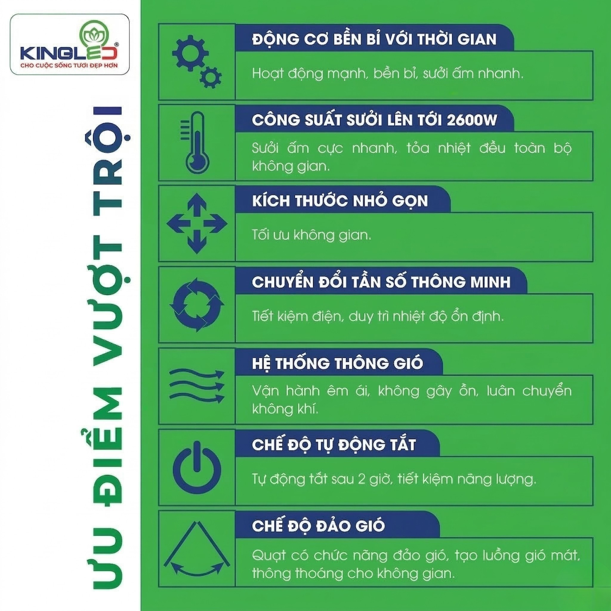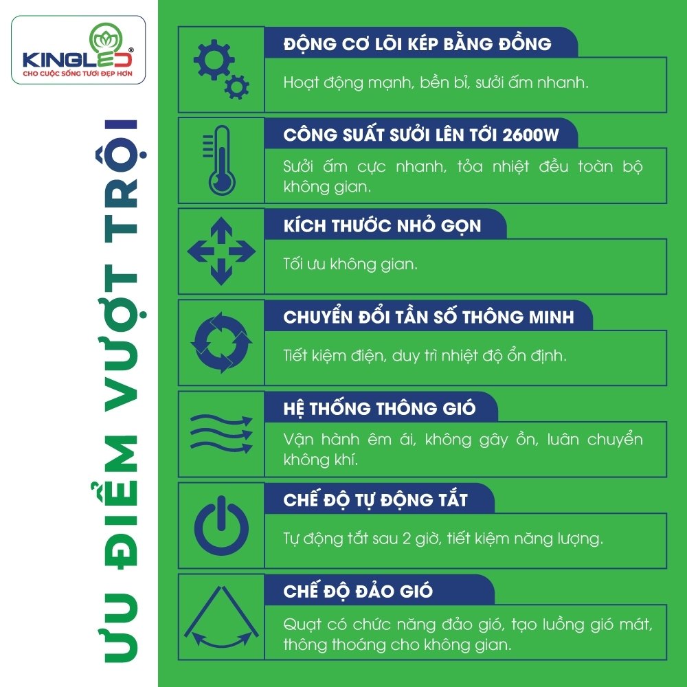 - Tăng cường công suất hoạt động lên đến 2600W, làm ấm toàn bộ không gian chỉ trong khoảng 60s - 120s (tùy diện tích)
